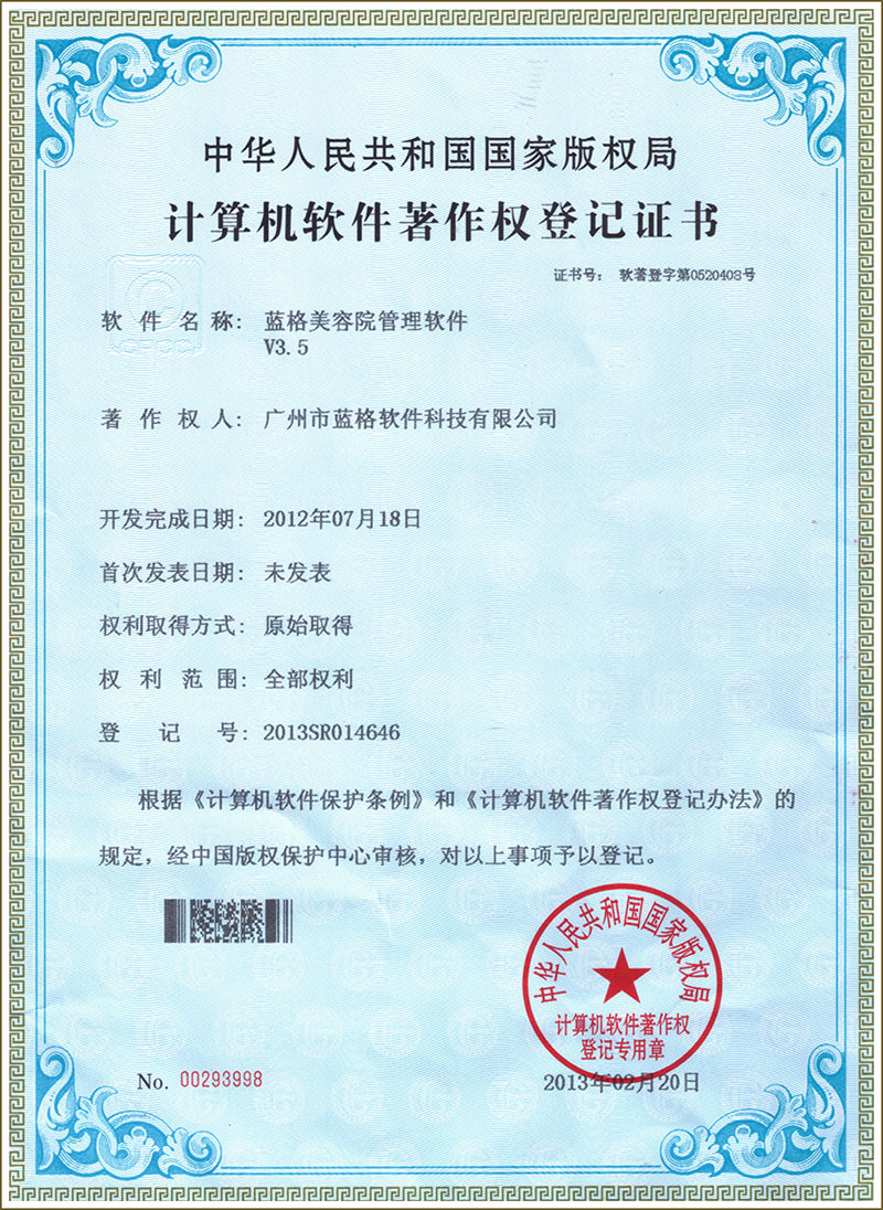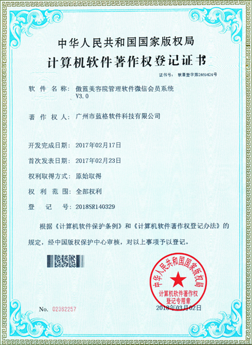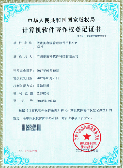 傲藍(lán)軟件認(rèn)定證書 美容管理軟件著作權(quán)證書