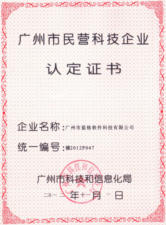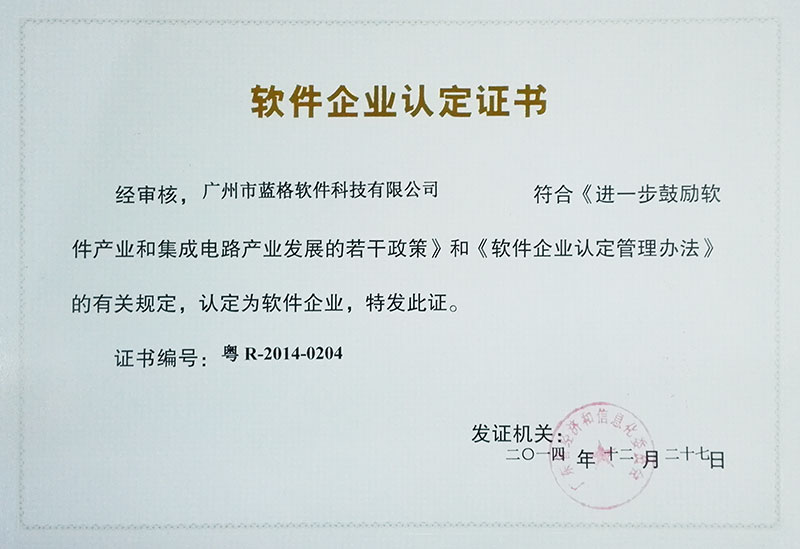 傲藍(lán)軟件企業(yè)認(rèn)定證書